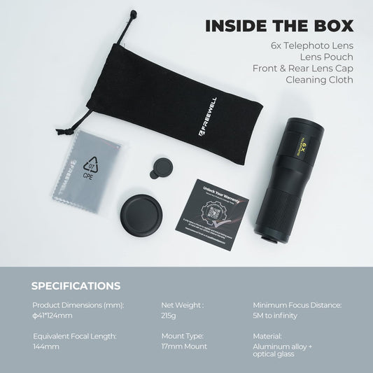 Freewell 6X Telephoto Lens 17mm Thread Professional Zoom Lens for iPhone & Samsung