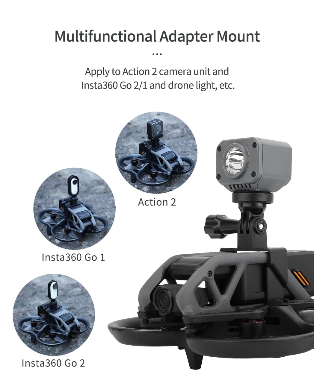 1.Multi-use expansion mount: can mount Action 2 main camera, Insta360 Go 2, Insta360 Go 1 sports camera, searchlights and other devices.