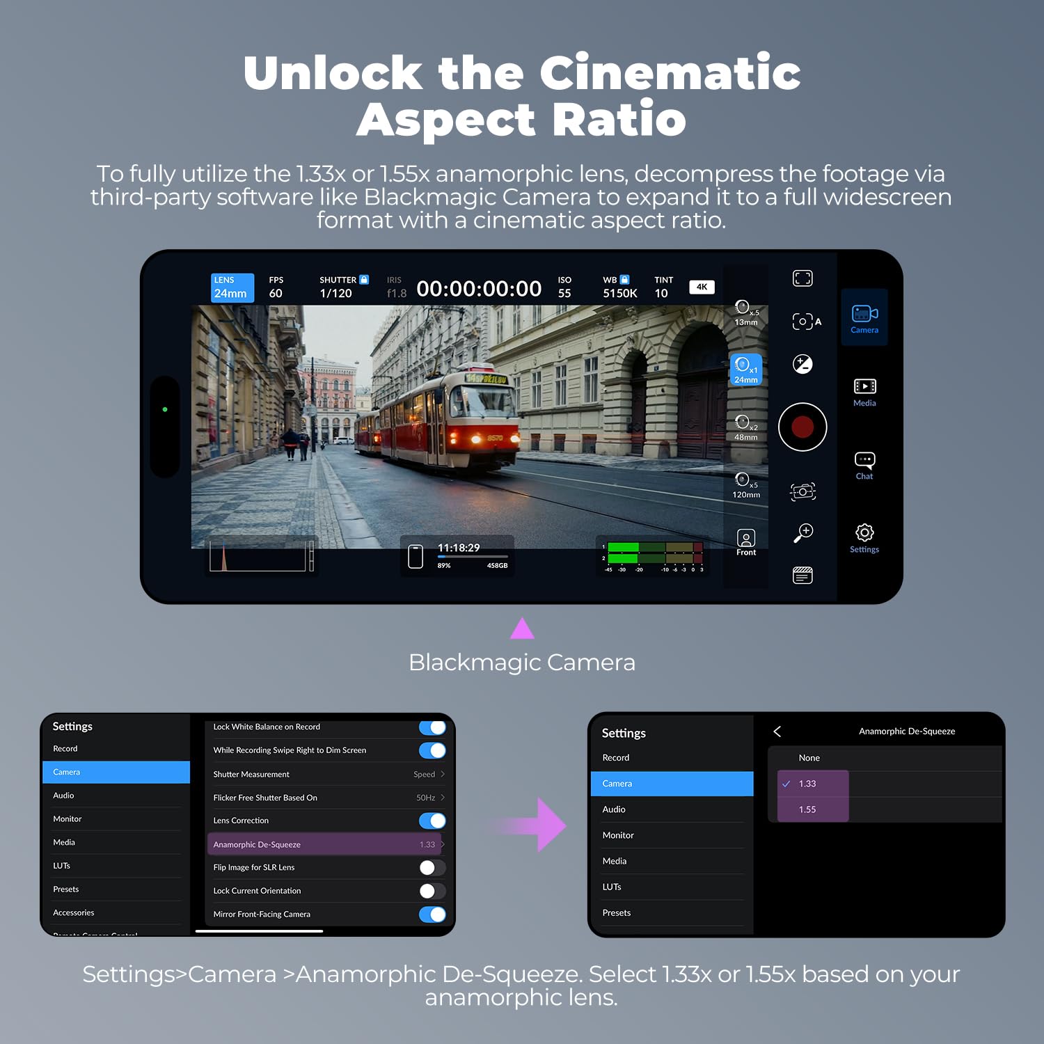 - Bring your footage alive: With third-party apps like Blackmagic Camera for easy desqueezing, maintaining the perfect aspect ratio for smooth editing.