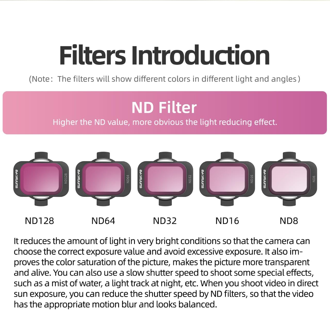 - Versatile Filter Set: Includes ND8, ND16, ND32 and ND64 filters for various lighting conditions and creative effects.