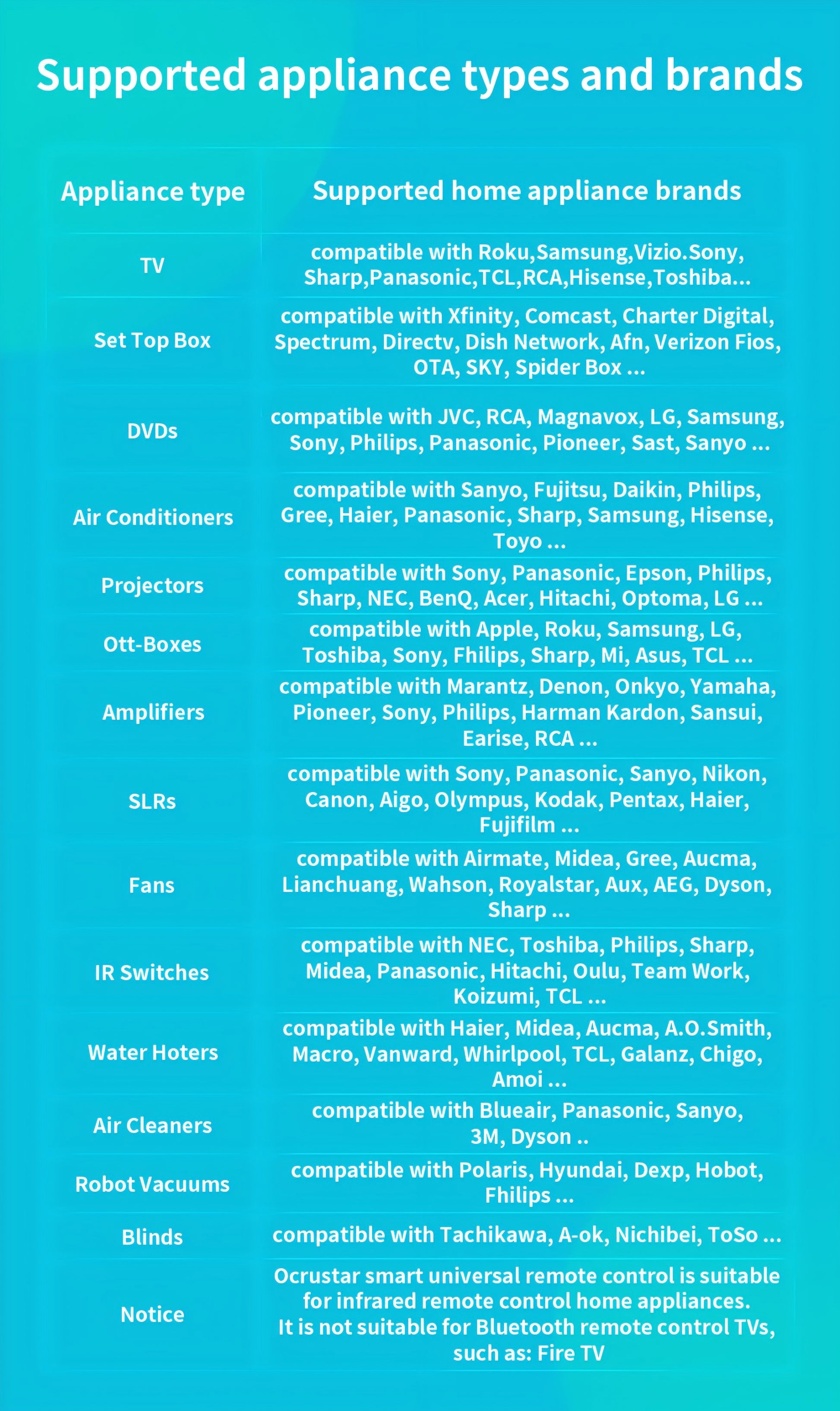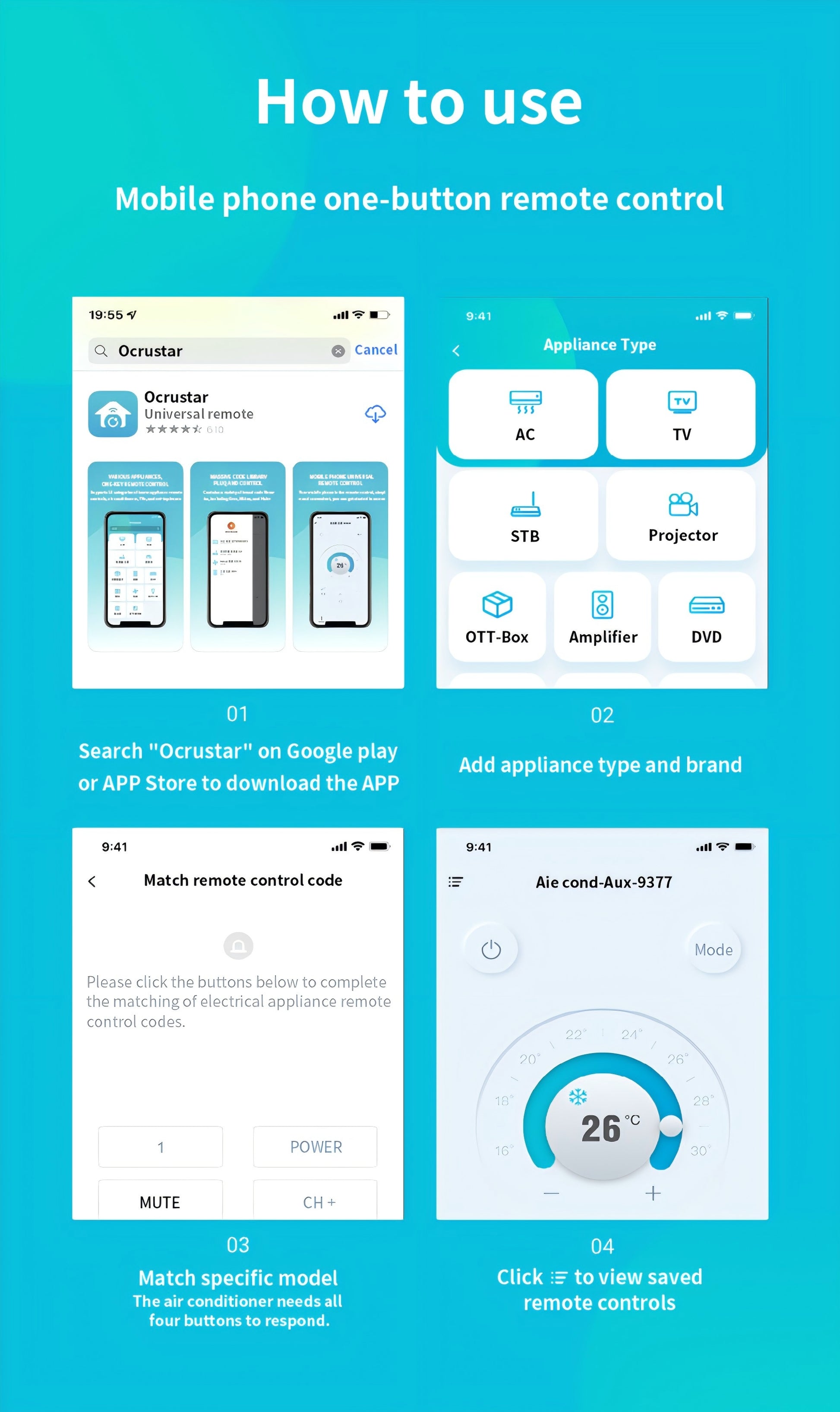 Use the official Ocrustar App for automatic device recognition, quick pairing, and access to the full remote database.